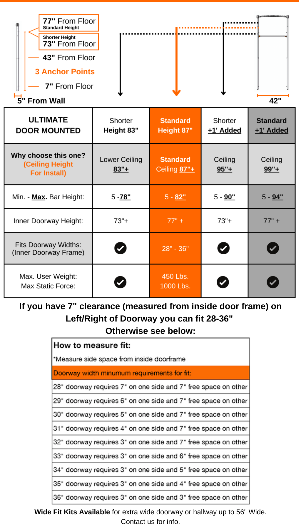 6 point doorway frame mount brackets (6x 6" length, and 3x 3" shorter length for tighter corner spaces included) to secure fixture to doorway (easy patch up when moving)